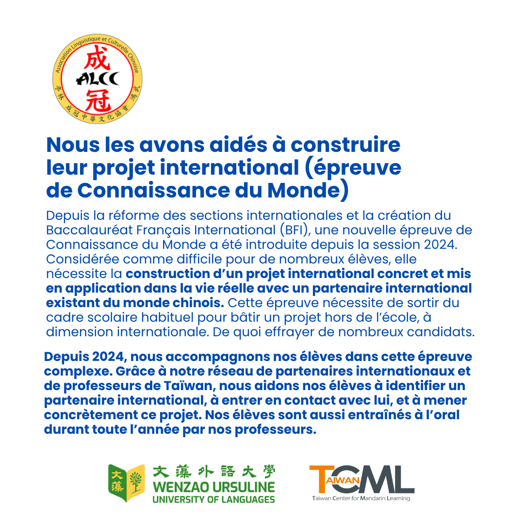 Découvrez les excellents résultats obtenus par nos élèves au Baccalauréat Français International (BFI) en Section Chinoise. Il s'agit de la 2e session depuis la réforme de l'Éducation Nationale en 2022 et la 1re session en 2024, où nous obtenions déjà 100% de mention !