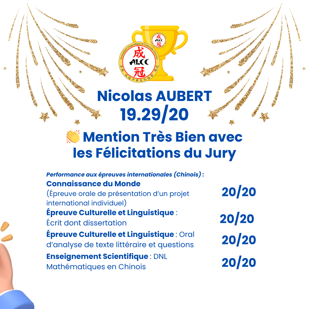 - AUBERT Nicolas (Cours de chinois adolescents) : 19.29/20 Mention Très Bien avec les Félicitations du Jury. Avec la performance exceptionnelle de 20/20 aux quatre épreuves de chinois. Il s'agit de la meilleure performance au Baccalauréat de tout le lycée Janson-de-Sailly, plus grande cité scolaire de France !