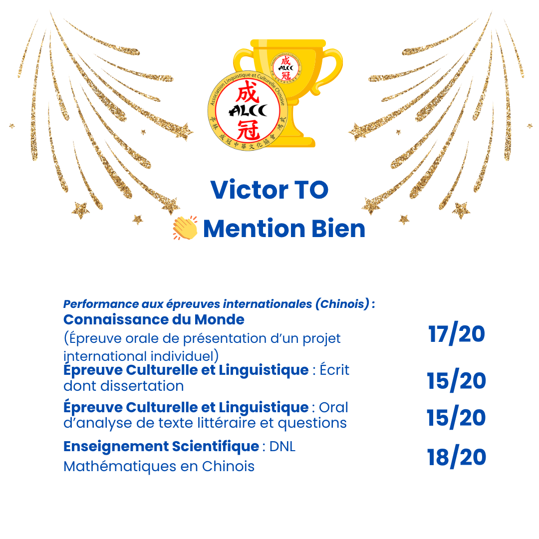 - TO Victor (Cours de chinois adolescents) : Mention Bien. Ses notes aux quatre épreuves de chinois sont, elles aussi très louables : 17/20, 15/20, 15/20, 18/20 ! De très bons résultats qui viennent récompenser cet élève très sérieux, motivé et assidu.